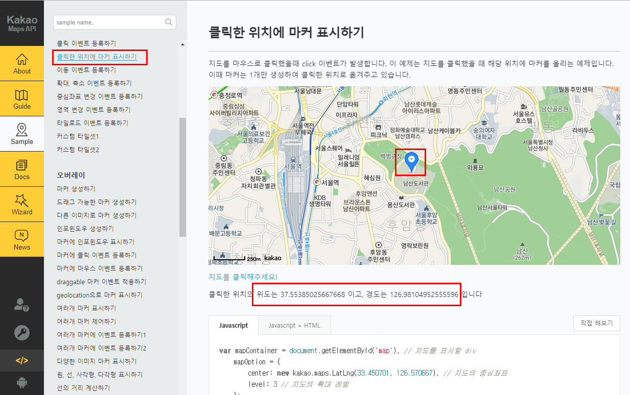 1. 카카오 맵 API - 클릭한 위치에 마커 표시하기 페이지 접속